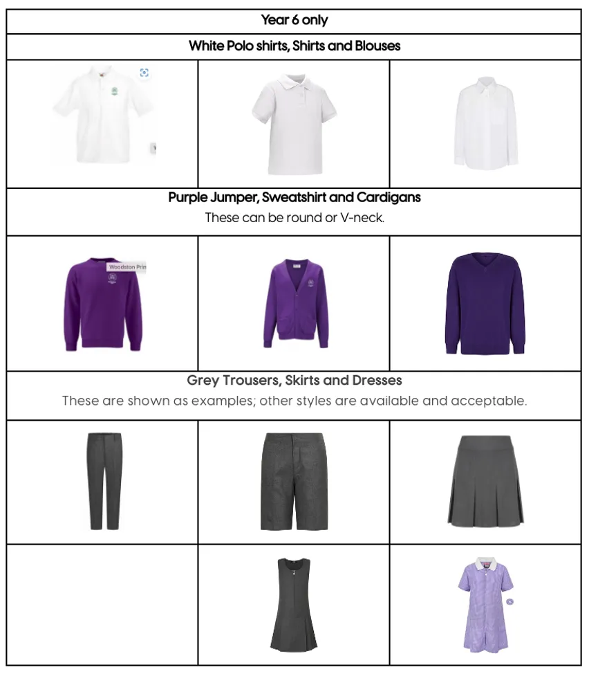 • Grey trousers, skirt or dress (purple checked dress for summer is optional)